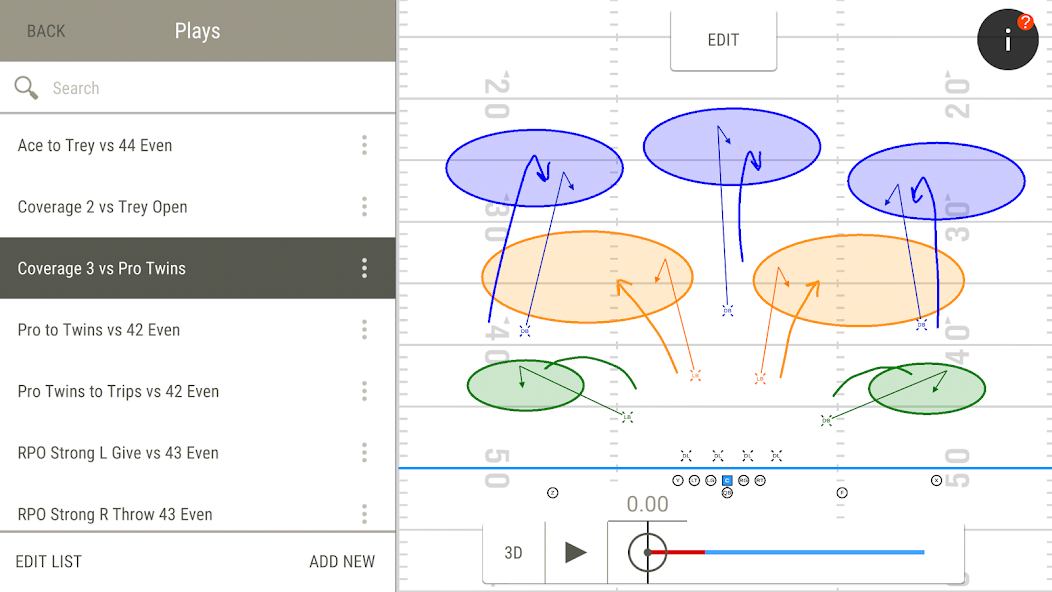 GoArmy Edge Football é um aplicativo GRATUITO para mudar o jogo criado pelo Exército dos EUA, que permite aos treinadores desenhar suas jogadas em um quadro branco digital. Obtenha repetições mentais da perspectiva de primeira pessoa ou de qualquer posição no campo com gráficos 3D em tempo real. GoArmy Edge Football vem pré-carregado com muitos exemplos de jogadas e exercícios para conceitos como reconhecimento de formação e leituras de RPO. GoArmy Edge Football oferece aos treinadores a capacidade de organizar suas formações e jogadas em exercícios virtuais para ensinar e testar seus jogadores.