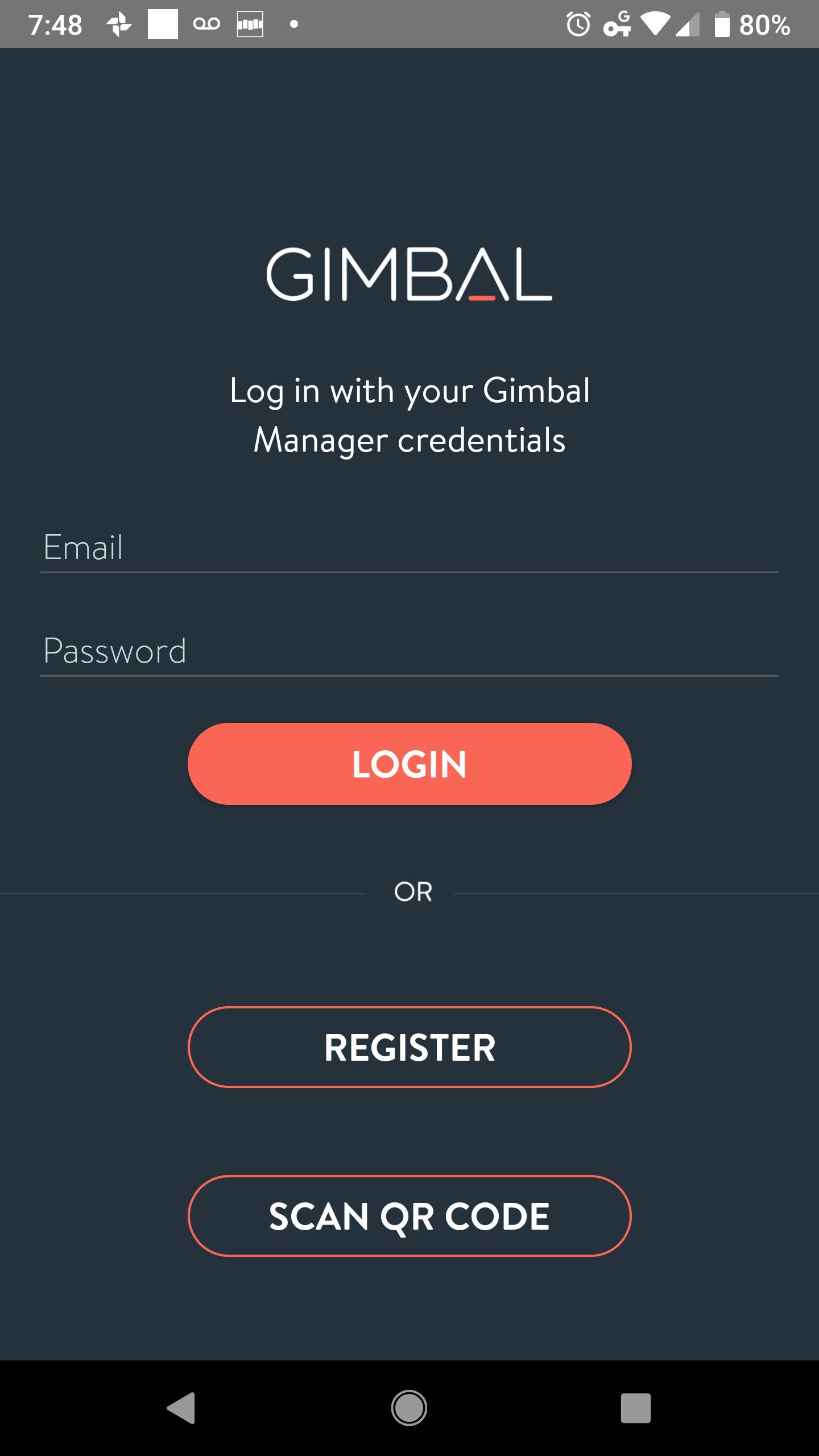 Use o seu gerenciador de cardan existente (https://manager.gimbal.com) ou registre-se no-aplicativo. Encomende seus beacons Gimbal em (https://store.gimbal.com).