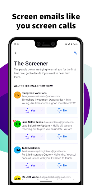 You screen your calls, so why can't you screen your emails? With HEY, you can. HEY puts you in complete control of who's allowed to email you. The first time someone emails you, you get to decide if you want to hear from them again.