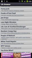 LOL Browser permite ver rapidamente os inúmeros sites que fazem da Internet uma fonte de risadas e Lulz. Além disso, você pode enviar suas próprias fotos hilárias a esses sites, compartilhar qualquer uma das imagens com seus amigos ou até mesmo salvar seu cartão SD para mais tarde! Se você gostaria de outro site adicionado a este aplicativo, não hesite em entrar em contato comigo :)