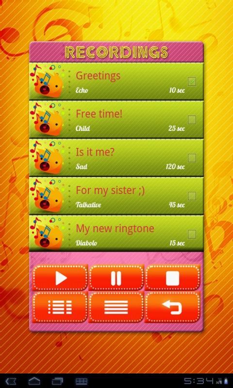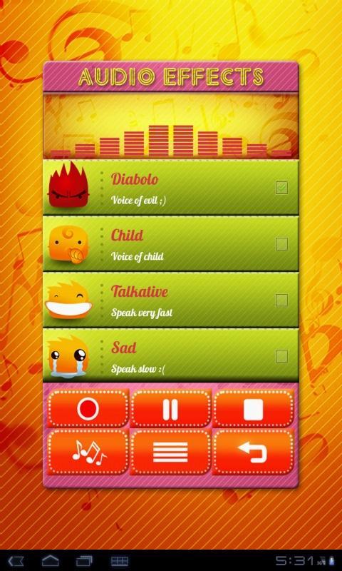 Você pode adicionar facilmente o efeito Echo ou misturar sua voz com o plano de fundo. Você pode enviar sua gravação como mensagem MMS ou e-mail ou defini-la como toque exclusivo.