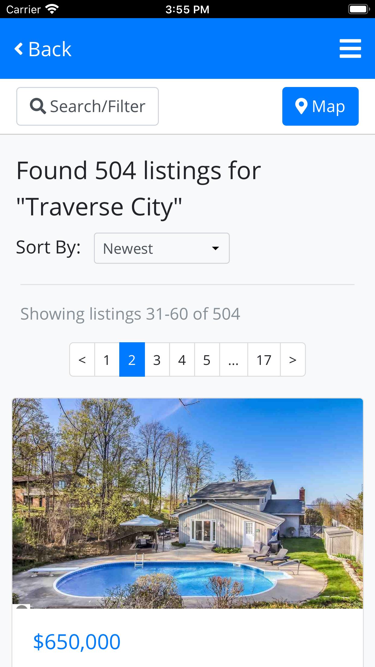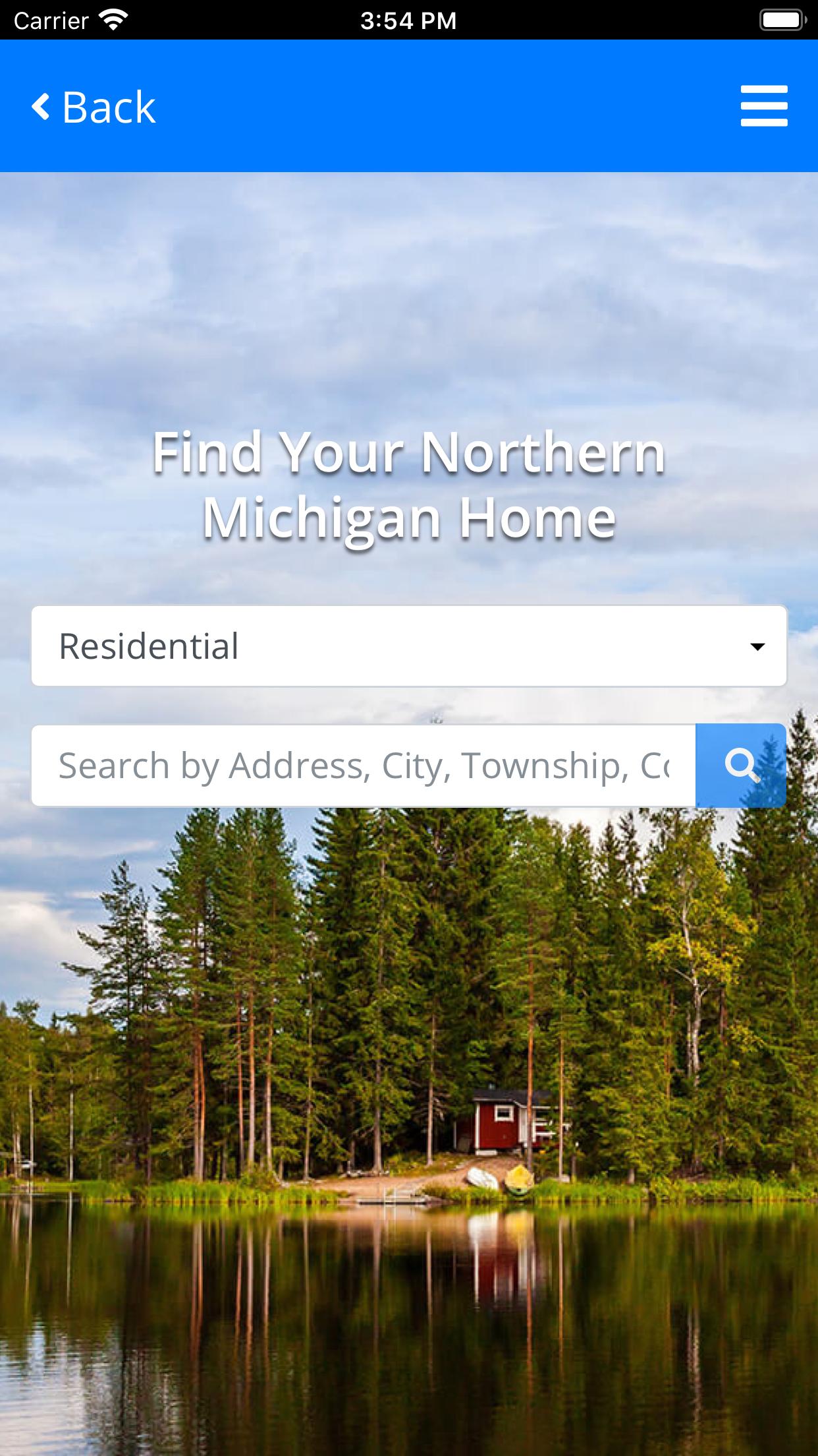 • Vista da lista e visão interativa do mapa das propriedades, incluindo fotos de miniaturas e detalhes da propriedade para terras residenciais, comerciais, vagas, propriedades de renda, casas abertas e propriedades de aluguel no norte de Michigan