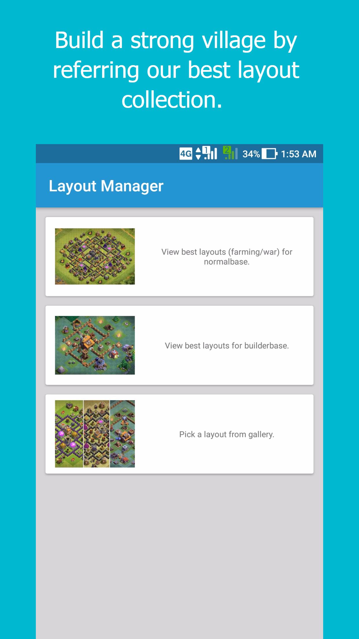 - Gerente de layout: escolha Layout de nossas escolhas ou da sua galeria. O layout será mostrado em sobreposição e o ajudará a construir a base de maneira fácil e rápida. Então, da próxima vez, se você se deparar com uma boa base, não se esqueça de fazer uma captura de tela.