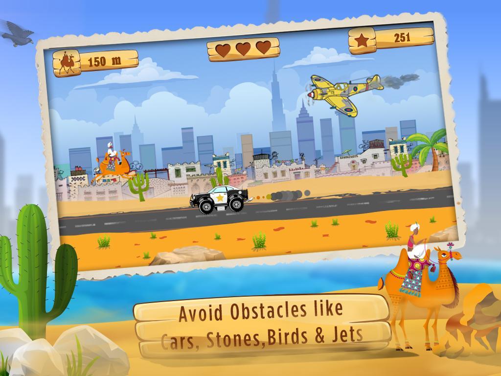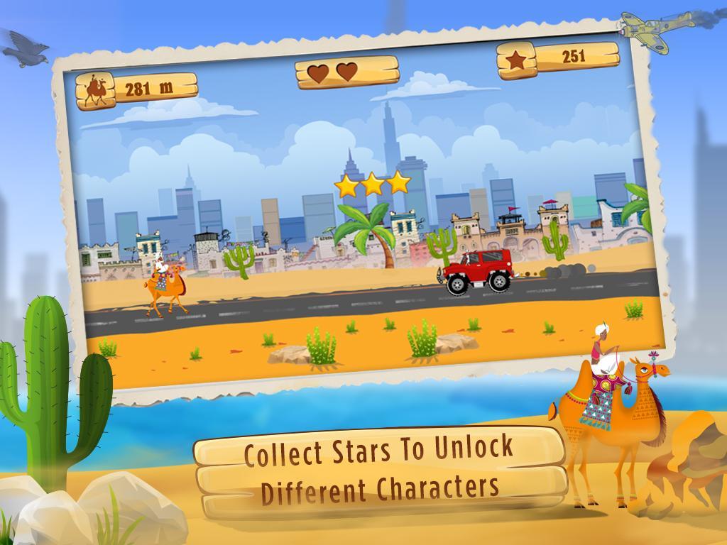 Dubai Camel Rider é um jogo de arcade cheio de ação. Escolha o seu piloto favorito e viaje pelas paisagens cênicas dos Emirados Árabes Unidos, com o famoso Burj Khalifa em segundo plano. Vá pelo tráfego como a polícia do DXB, os carros de corrida 4x4 e os caças. Sobreviva às tempestades de areia e pontue mais com a ajuda de impressionantes power-ups. É hora de um dune batendo em Dubai!