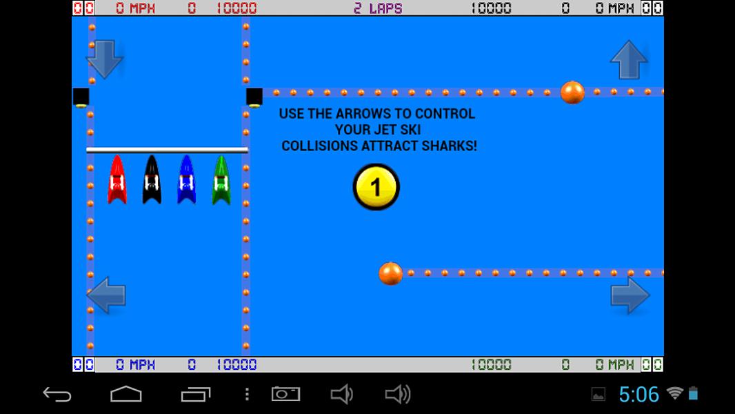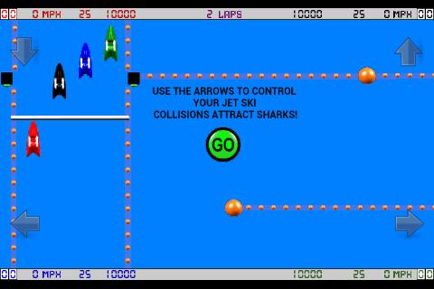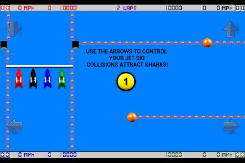 Corra seu Jet Ski contra três outras bicicletas em torno de um curso. Você escolhe qual bicicleta Jet Ski deseja controlar. Bata nas outras bicicletas muitas vezes e você atrairá os tubarões. Todas as voltas de bicicletas, tempos de volta, os melhores tempos e velocidades são mostrados e há um quadro de líderes para os melhores momentos.