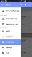 abFiles использует новую структуру доступа к хранилищам Kitkat (SAF), которая позволяет приложениям Android для прямого просмотра и открытия документов на вашем компьютере. Все больше и больше приложений Android поддерживают SAF, такие как Google Quickoffice, Gmail и Google Drive.