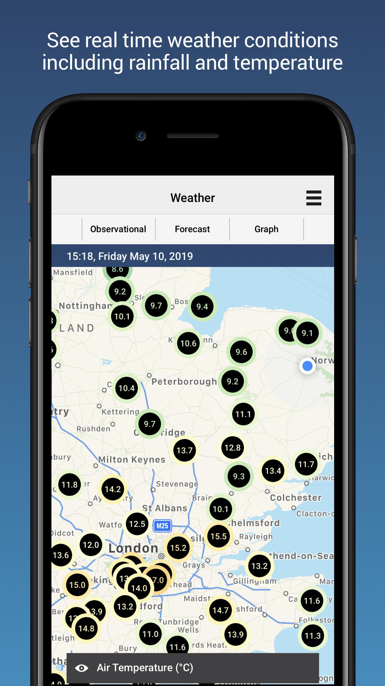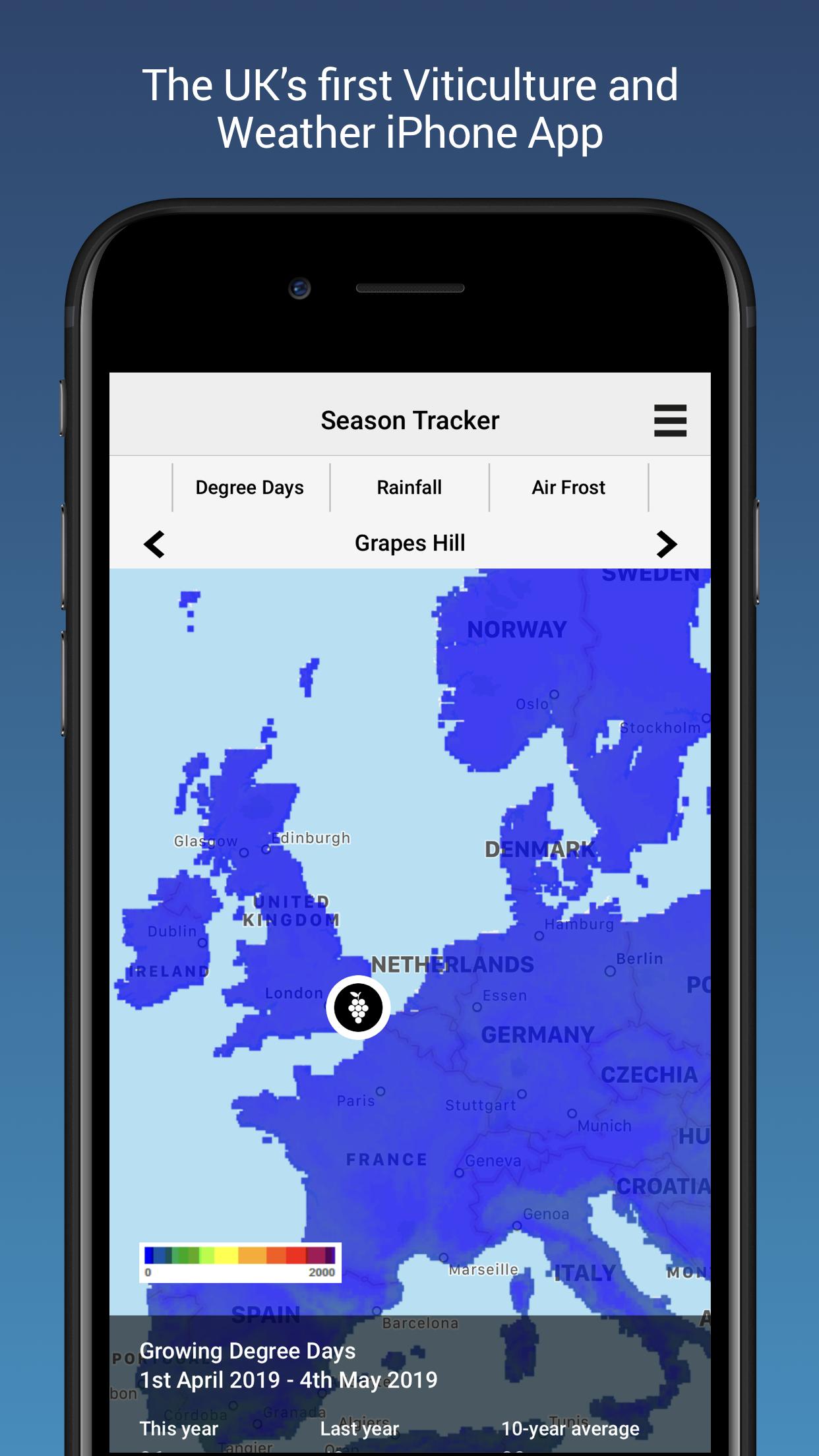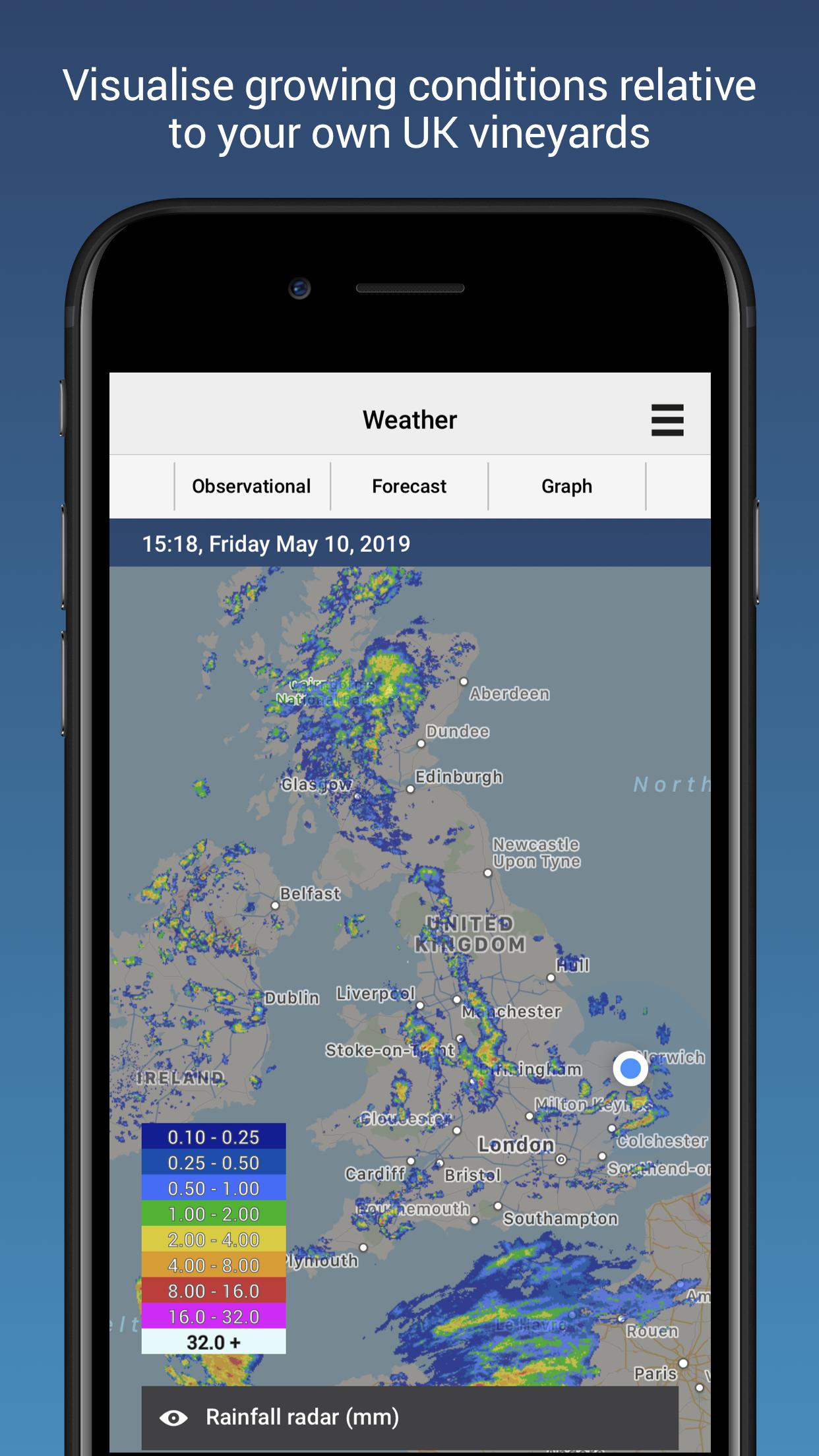 + Прогноз: Получайте услуги по прогнозированию погоды, специально предназначенные для виноградарства для британских виноградников, которые будут включать в себя: текущие погодные условия, прогнозы погоды на 5-10 дней, предупреждения о экстремальных погоде, а также предупреждения о брызгах и сборе урожая.