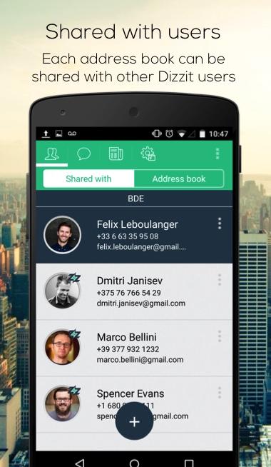 Dizzit - это мобильное приложение, которое позволяет вам обмениваться индивидуальными адресными книгами для нескольких пользователей. Это приложение было разработано для пары, которая хочет управлять повседневной жизнью, а также ассоциацией или организацией, которая должна иметь дело с несколькими членами или компанией, которая хочет делиться контактами с клиентами. Каждая адресная книга содержит набор контактных файлов, которые можно обмениваться с другими пользователями Dizzit .