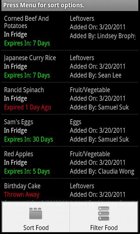 - Просмотреть еду и сортировать по дате, истечения срока действия и названия