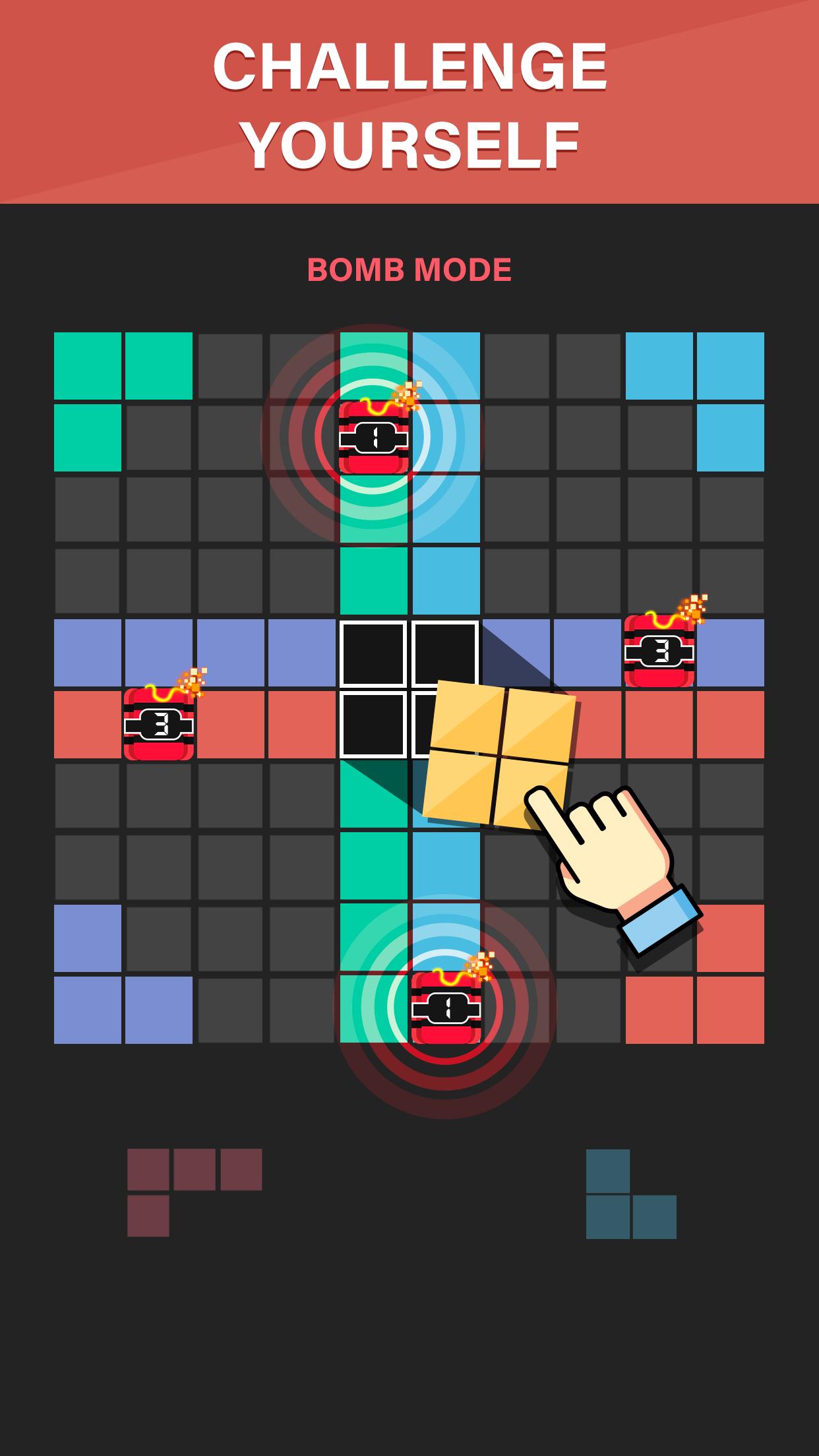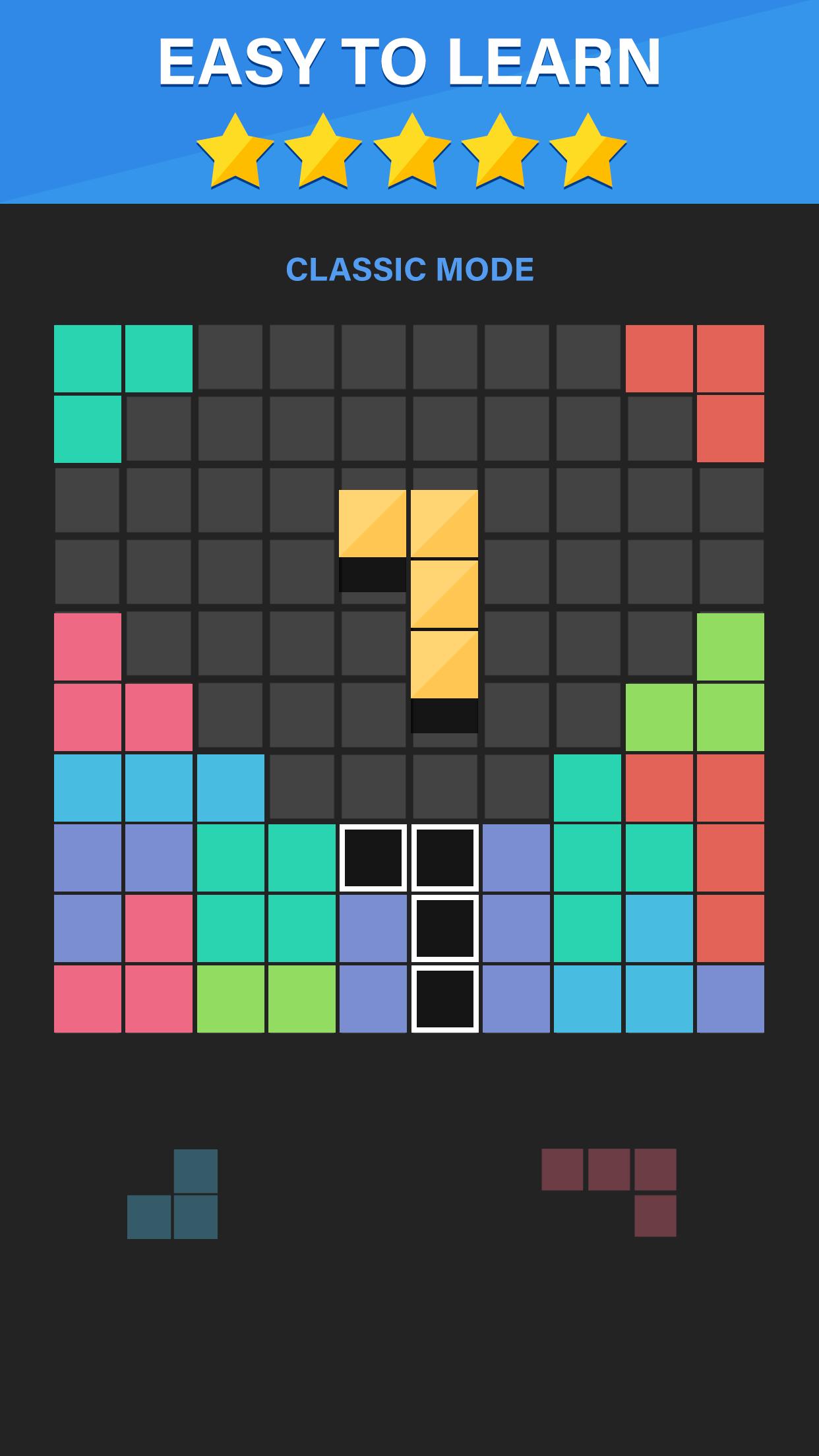 Игровая доска установлена на сетке 10x10, все, что вам нужно с этими блоками, - это просто удерживать и переместить ее, чтобы создать и уничтожить полные линии на экране, как по вертикали, так и по горизонтали, и остановить эту удивительную блок -плитку от заполнения экрана.