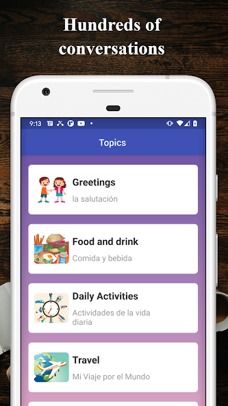 西班牙词汇对话应用程序包括100多次西班牙对话,涵盖了9个类别中最常用的西班牙对话:
