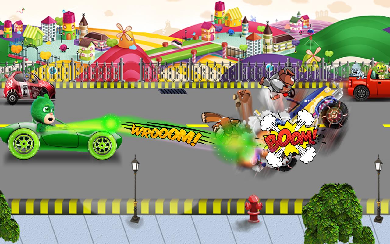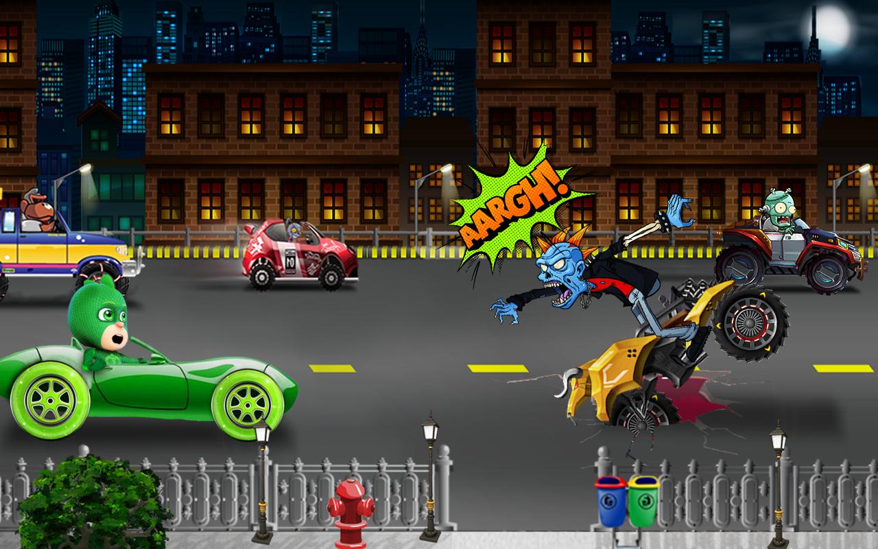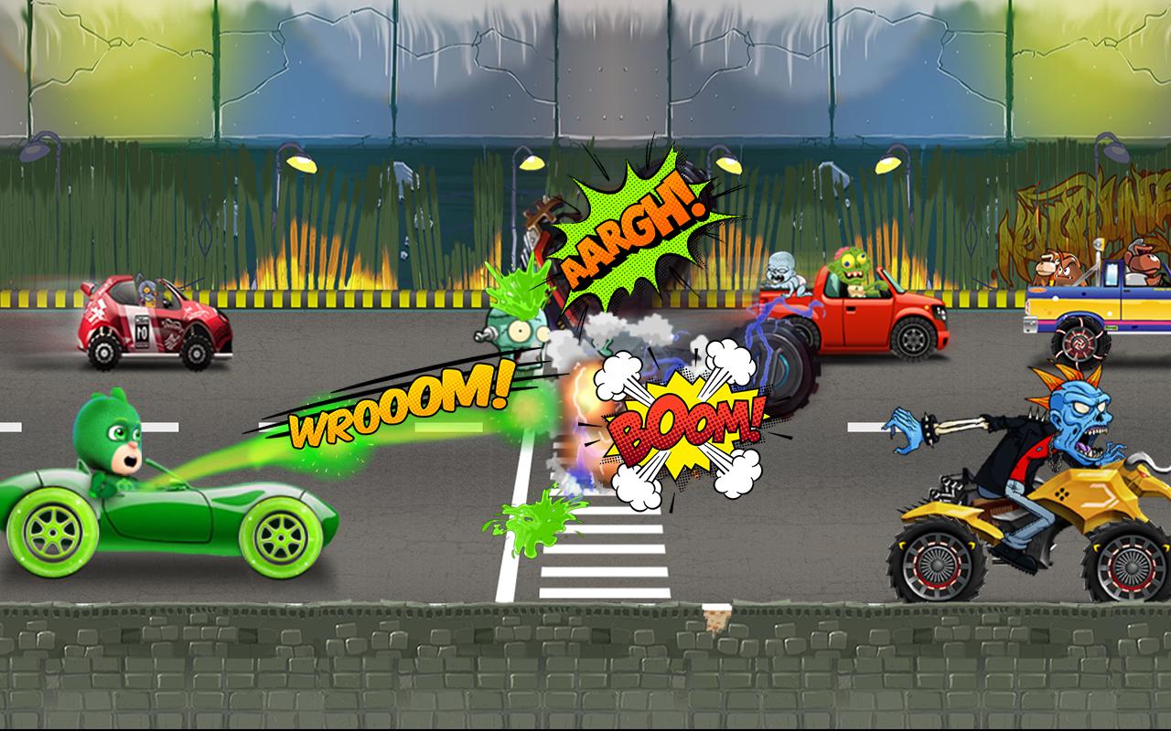 Road Pj Battle Masks Green游戏非常有趣。快来帮助孩子们面具通过收集“火箭”并向敌人的汽车射击来摧毁汽车。