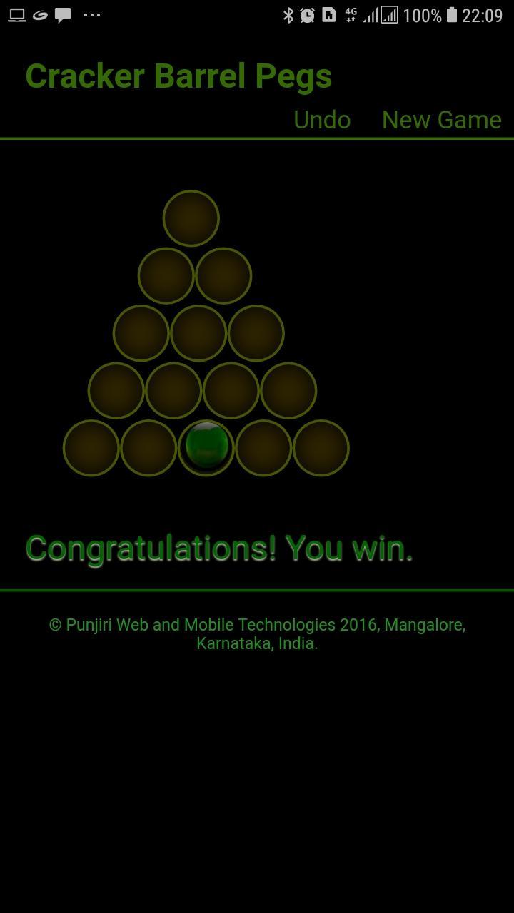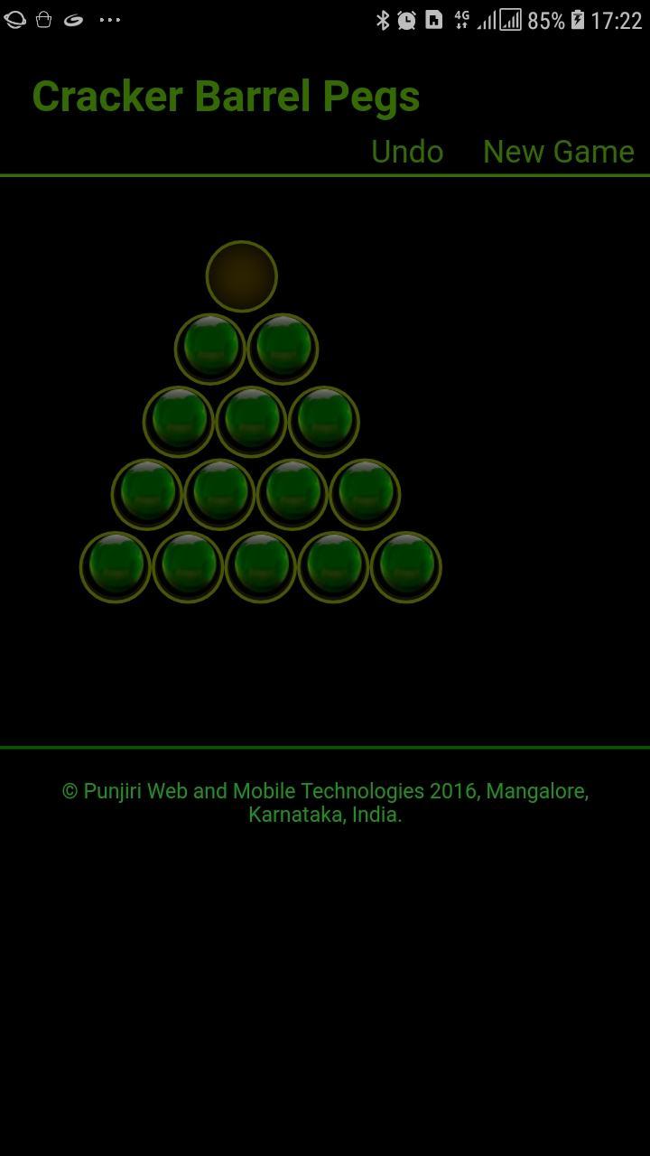 The Cracker Barrel Peg Game涉及在带有孔的三角形板上移动钉子。在游戏开始时,除一个角孔外,整个板上都充满了钉子。有效的举动是将钉子跳到相邻的钉子上,进入两个位置的空洞。这一举动可以朝任何方向进行。然后删除跳过的钉子。游戏目标是清空整个板,除了一个孤立的钉子。