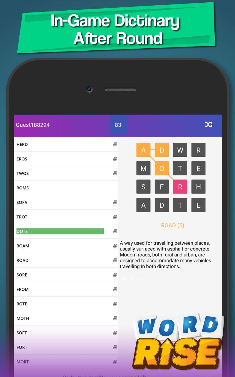 给您4x4的信件委员会,在有限的时间内,您需要找到尽可能多的单词。每一轮后,您都将与其他球员相比。然后开始新的回合!