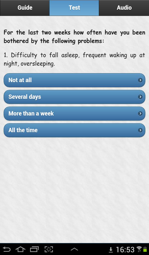 在應用程序中,您將開始快速測試以評估您的抑鬱水平。看到結果後,您將獲得有關如何克服抑鬱症的詳細說明,以及專業心理學家Nikolai Zakharov博士(PHD)創建的特殊錄音。通過定期收聽Zakharov博士的特別錄音,並按照他的建議,您將邁出第一步,以克服抑鬱症。
